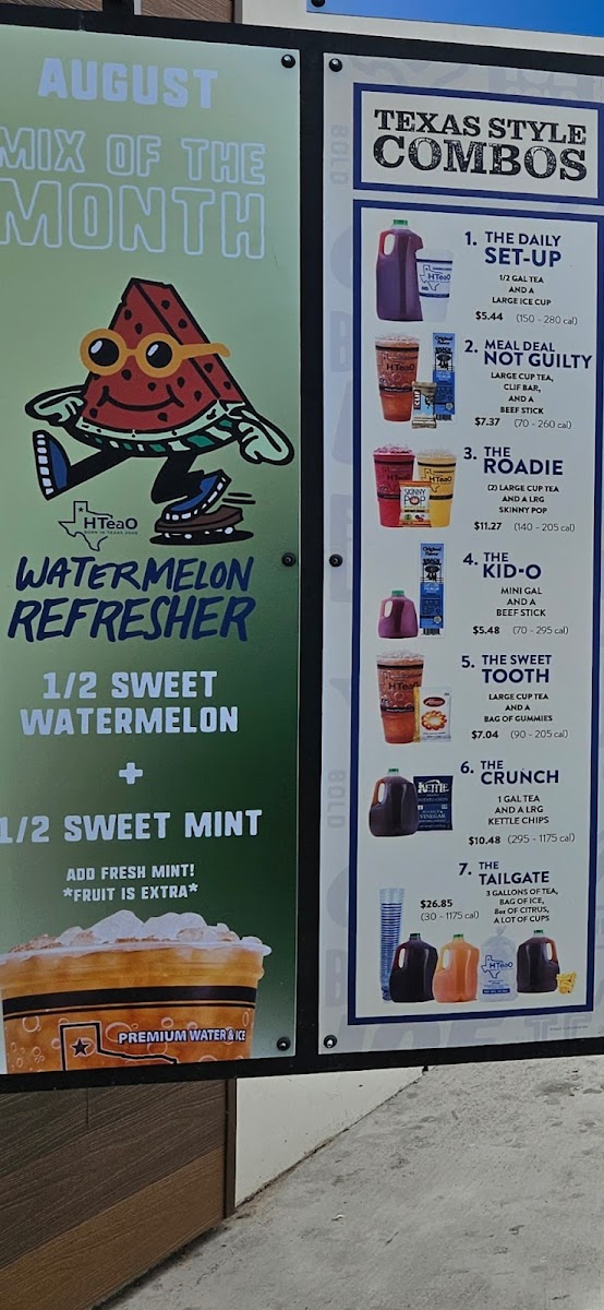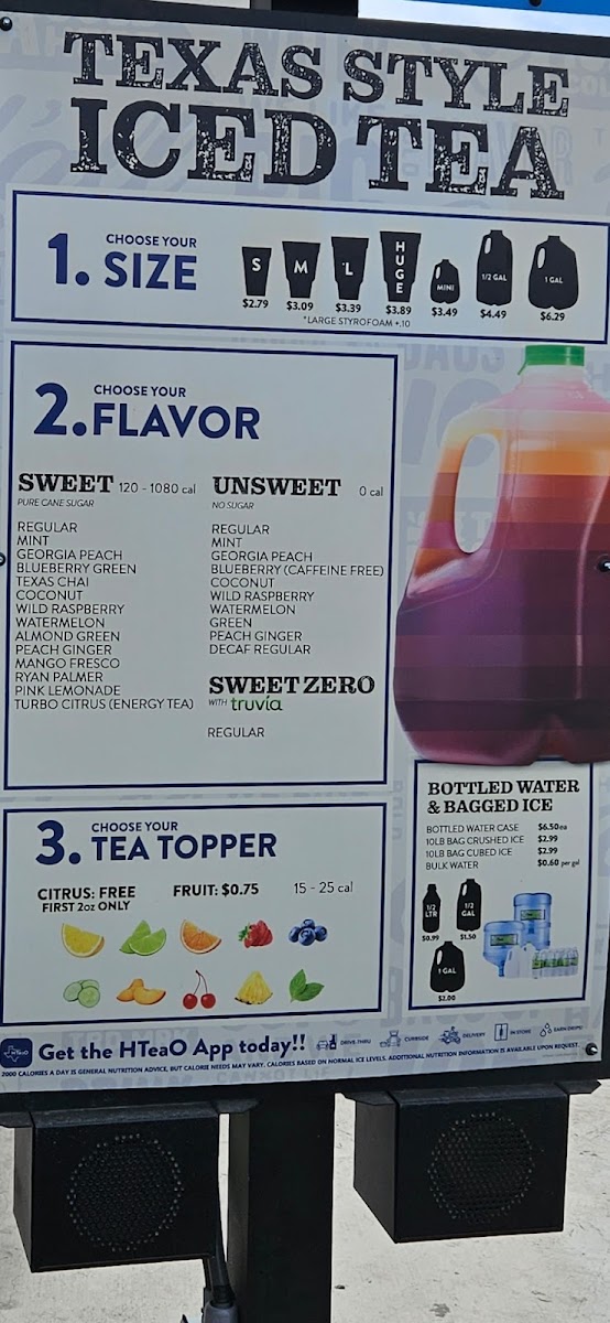 The menu at Hteao in Carlsbad offers a delightful variety of beverages and snacks, making it a refreshing stop for any occasion. For those looking for something unique, the Double Berry Refresher and Hot Honey Refresher are available for a limited time, alongside the Sweet Spiced Orange Pistachio Latte (offered hot or iced) and the Iced Pistachio Latte & Cookie Combo. The iced tea selection is extensive, with flavors like Sweet Spiced Orange, Sweet Blueberry Green, and Sweet Georgia Peach, while unsweetened options include Unsweet Decaf Blueberry and Unsweet Coconut. Thirst-quenching choices like the Razzler Refresher, Dirty Cherry Poppi, and Desert Pear Refresher are perfect for hydration, and the Secret Menu offers playful drinks like Apple Pie and Cotton Candy. For coffee lovers, there's an array of iced and hot beverages, including the Pistachio Latte, Iced Caramel Macchiato, and the indulgent Iced Cinnamon Honey Macchiato. The snack options are equally tempting with treats such as Just Desserts Cupcakes, Clint & Sons Beef Sticks & Jerky, and Legally Addictive Cookies. Hteao also features convenient hydration boosters like the HTeaO Energy Shots and LMNT Zero Sugar Electrolytes, along with a selection of HTeaO Lip Balms in flavors like Blueberry Tea and Texas Chai Tea. To top off the experience, you can grab a gallon of sweet iced tea or a bottle of stainless steel alkaline/sparkling water, ensuring there's something for everyone to enjoy.